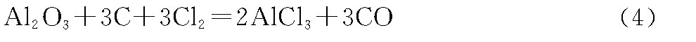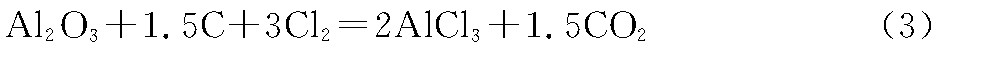 氧化鋁法是以氧化鋁、氯氣及碳三者為原料共同反應制取無水三氯化鋁。國外研究者20世紀60年代后期曾對氧化鋁法制無水三氯化鋁的反應機理進行了研究, 他們認為氧化鋁法制無水三氯化鋁的反應式為: