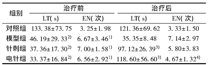 表1 各組小鼠治療前后避暗試驗LT及EN比較(±s,n=10)