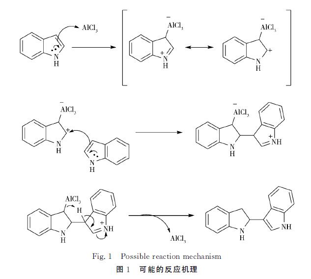 2.2 反應(yīng)機(jī)理討論 筆者結(jié)合相關(guān)文獻(xiàn)及實驗結(jié)果,提出了可能的反應(yīng)機(jī)理:首先三氯化鋁活化吲哚的C-3位,生成亞胺 離子中間體,使吲哚的C-2位顯正電性;接下來另一分子吲哚C-3位的碳原子進(jìn)攻這個正電中心[17], 實現(xiàn)偶聯(lián);偶聯(lián)中間體發(fā)生質(zhì)子轉(zhuǎn)移[并失去三氯化鋁形成最終產(chǎn)物,離去的三氯化鋁繼續(xù)催化反應(yīng) (圖1)。